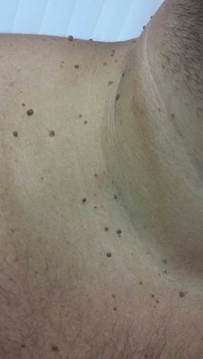 Rarely, they can be described in the Birt-Hogg-Dubé syndrome (associated with fibrofolliculomas and trichodiscomas) and the polycystic ovary syndrome. Microscopically, an acrochordon consists of a fibro-vascular core (loosely arranged collagen fibres, many capillaries, sometimes also with fat cells), covered by a thickend or thinned-out epidermis.