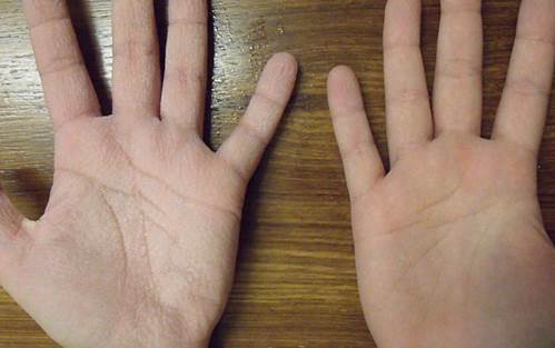 Aquagenic wrinkling of the palms (AWP) often occurs in patients with cystic fibrosis but it may also occur in carriers of the cystic fibrosis gene Symptoms appeared after a few minutes (usually less than 2 min) after exposure to both warm and cold water (“hand in the bucket sign”), particularly after showering and washing dishes.