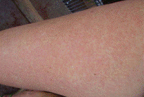 Talvolta l’esantema è scarlattiniforme con placche diffuse di colore rosso vivo, calde, dalla superficie lievemente granulosa, senza presenza di zone di cute sana, più intense alle pieghe, caratterizzate da cute desquamante a grossi lembi nella fase di risoluzione.
