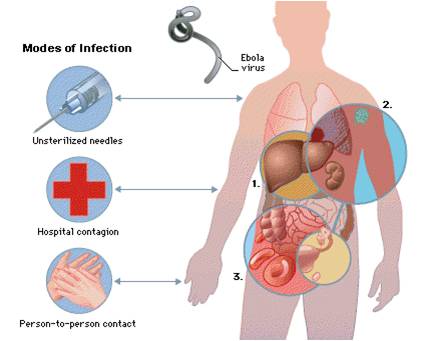 4) prepared people for burial. The bodies of people who have died of Ebola hemorrhagic fever are still contagious, because the virus may be on the skin. Furthermore, some traditional burial customs, whereby all mourners touch the body, also causes the virus to spread