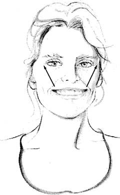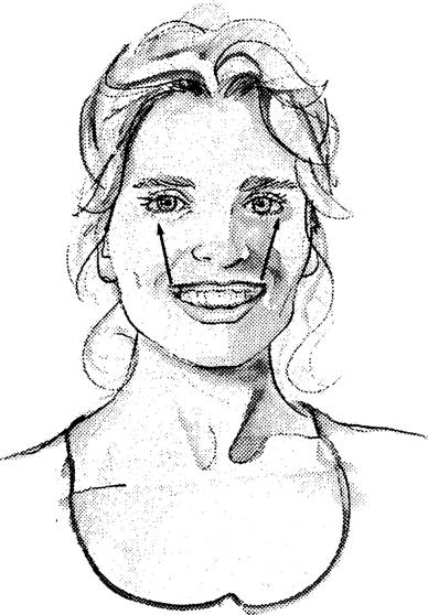 Modalità di esecuzione: per imparare il movimento proprio dell’esercizio, conviene inizialmente porre il polpastrello del dito medio della mano destra all’angolo della bocca destro e quello sinistro a sinistra. A questo punto aiutare il movimento nella direzione delle frecce indicate sull’illustrazione, tenendo conto che questo movimento verso l’alto non è un sorriso con gli angoli della bocca, ma dei muscoli superiori delle guance. Presa coscienza, si passa all’esercizio che deve essere eseguito in un solo, lento movimento.