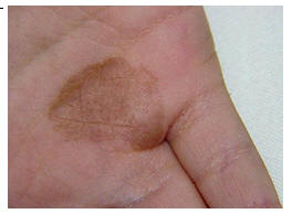 It most commonly occur on the palmar aspects of hands with persistent slowly espanding demarcated dark brown to black irregularly shaped patch giving a spattered appearance that resemble silver nitrate or India ink stains.