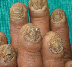 Le unghie crescono molto lentamente o sembrano aver interrotto la loro crescita. Il colore sui bordi è lievemente più scuro,e si osserva l’assenza della cuticola e della lunula, un aumento della curvatura antero-posteriore e latero-laterale della lamina. Vi può essere onicolisi (distacco delle lamina ungueale dal letto sottostante) di una o più unghie.