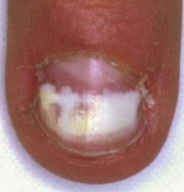 Si può osservare una pseudoleuconichia, in cui l’aspetto biancastro della lamina ungueale è dovuta ad infezione fungina superficiale (onicomicosi bianca superficiale)