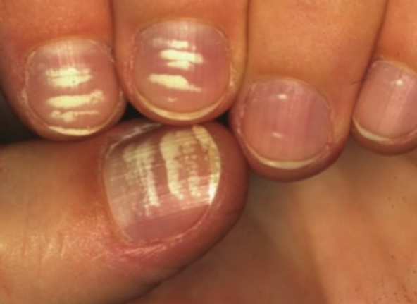 La presenza di una linea marrone tra la zona rosata e il margine libero dell’unghia, suggerirebbe una malattia renale come fattore causale.