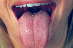 La lingua appare nella parte mediana posteriore di colore bruno-nerastro, con papille filiformi allungate e ingrossate.