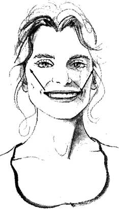 Modalità di esecuzione: per imparare il movimento proprio dell’esercizio, conviene inizialmente porre il polpastrello del dito medio della mano destra all’angolo della bocca destro e quello sinistro a sinistra. A questo punto aiutare il movimento nella direzione delle frecce indicate sull’illustrazione, tenendo conto che questo movimento verso l’alto non è un sorriso con gli angoli della bocca, ma dei muscoli superiori delle guance. Presa coscienza, si passa all’esercizio che deve essere eseguito in un solo, lento movimento.