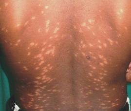 The clinical features are similar to PMH ( the sex ratio, age of occurrence 15–25 years, seasonality -end of summer-, skin phototype of the affected patients III–V, widespread and symmetrical involvement of the skin of the trunk with numerous, round, non-scaling hypomelanotic patches without a preceding inflammatory phase and with a long-lasting duration, decrease epidermal melanin on histological examination, absence of spongiosis, reduced number of active melanocytes and a decrease in the number and size of melanosomes in the affected skin on ultrastructural studies). No atopy or associated pathologies or familial cases were reported.