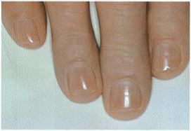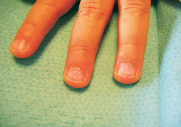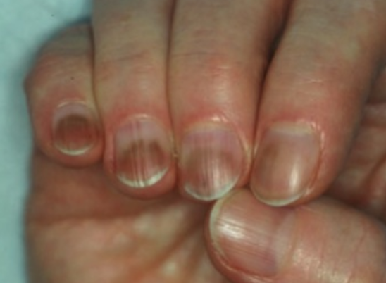 La presenza di una linea marrone tra la zona rosata e il margine libero dell’unghia, suggerirebbe una malattia renale come fattore causale.