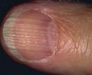 - leuconichia striata, quasi sempre segue un manicure aggressivo che traumatizza la cuticola e la matrice distale; si presenta con delle bande orizzontali parallele di colorito bianco opaco separate da aree di aspetto normale.