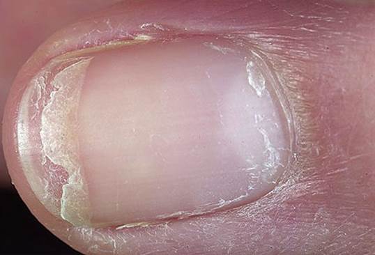 Si può osservare una pseudoleuconichia, in cui l’aspetto biancastro della lamina ungueale è dovuta ad infezione fungina superficiale (onicomicosi bianca superficiale)