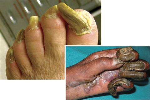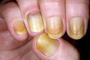 Le unghie crescono molto lentamente o sembrano aver interrotto la loro crescita. Il colore sui bordi è lievemente più scuro,e si osserva l’assenza della cuticola e della lunula, un aumento della curvatura antero-posteriore e latero-laterale della lamina. Vi può essere onicolisi (distacco delle lamina ungueale dal letto sottostante) di una o più unghie.