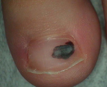 Rispetto al nevo, il melanoma ungueale si caratterizza per ‘irregolarità della linea che si allarga irregolarmente e può talvolta mostrare (e quindi di aiuto alla diagnosi) una pigmentazione irregolare, che nel corso dei mesi si diffonde alla piega ungueale adiacente (segno di Hutchinson).